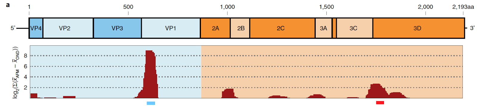 Figure 2. Enterovirus Enrichment at Specific Genome Sites in EV-A71 in the CSF of Healthy Controls and AFM Cases. Following VirScan sequencing, enterovirus-derived peptides found to be enriched in the CSF of AFM patients were plotted on genome sequence for different strains of enterovirus. The figure above demonstrates the enrichment of specific peptides found in the EV-A71 strain of the enterovirus. The BLASTp computer program was used to match viral peptides with their appropriate site in the EV-71A genome. The larger red peaks display greater enrichment of viral peptides in AFM patients when compared with healthy controls. Peptides such as VP1 were found to be significantly enriched in AFM patient’s CSF when compared to controls’ CSF.
